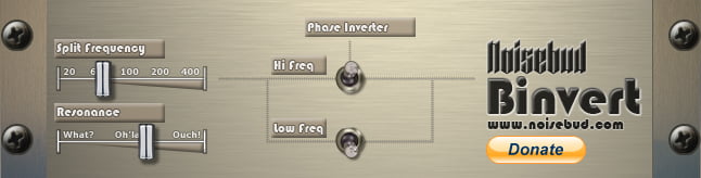 Our latest invention, say hi to Binvert Noisebud, 2010, October 27 It’s been a while since we released any new or updated VST plugin, but here’s a little fellah with an ugly name that you haven’t seen before. Binvert is a plugin made for possible problems that can occur in mixes when you use several bass drums and overall bass heavy material and the different bass sounds phase each other out. We often have situations when we think a phase shift on any of the sounds will fix the problem and it does, in the lower frequencies anyways but what happened with the nice mid and high transients? Well, no problems cause we created Binvert. Here’s what it does: It takes the signal and splits in into two bands (split point is adjustable between 20-400Hz). After the split we put in a phase invert for both bands so you can invert the polarity of the two bands independently from each other. Problem fixed, the bass is still heavy and the mid/high transients stay crisp. But it is a Noisebud plugin so we couldn’t just make a boring tool, we attached a resonance control to the filter that isn’t really supposed to be there at all but it’s fun. We use it to self oscillate at low frequencies so it’s a bit of a bass-drum-low-frequency-replacer-plugin… But then again… no… it’s a Noisebud. Techy geek stuff: Yes, it would be more appropriate to use the term polarity than phase. We choose phase because it’s more commonly used. Grab it at the plugins page! Blog